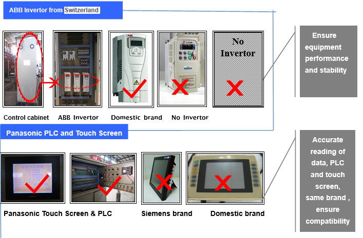 1.Kontroló rendszer: adpot Import ABB invertor és Panasonic PLC és érintőképernyős elektronikus vezérlőelemek a berendezés stabil működésének biztosításához.